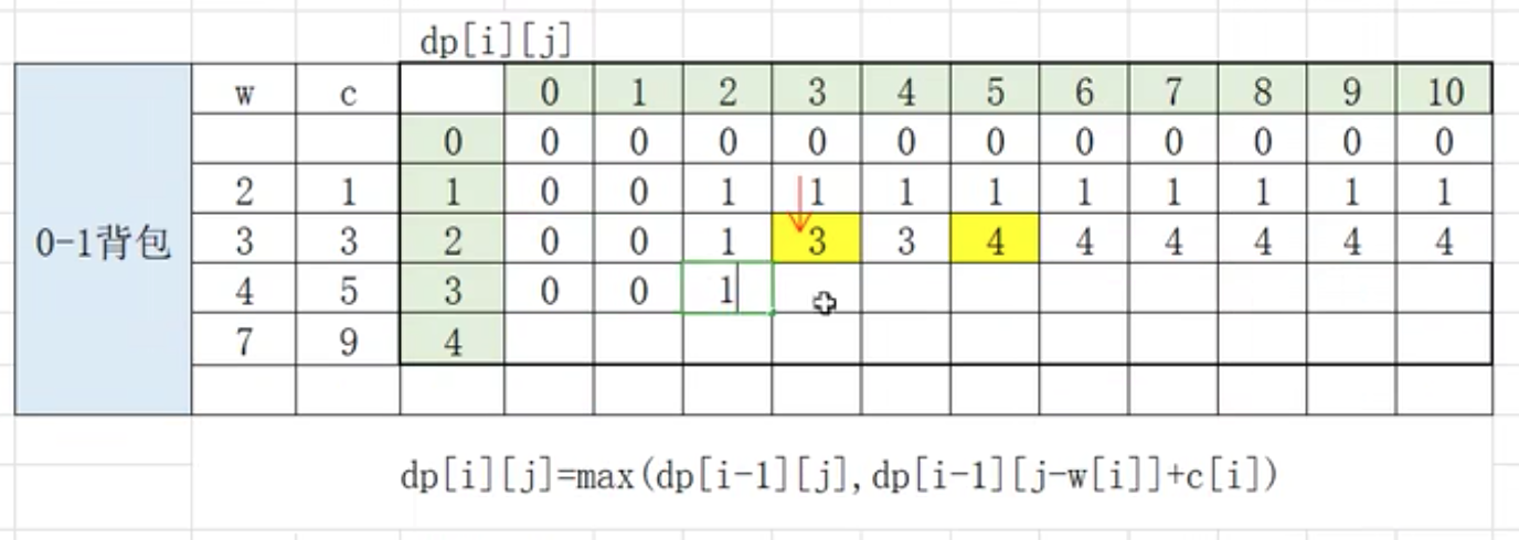 前i个背包可选&最大容量为j的情况下(dp[i][j]) 最大价值为: 前i-1个背包可选情况下的最大值 和 前i个背包(dp[i-1][j-w[i]]+c[i]) 的最大值.