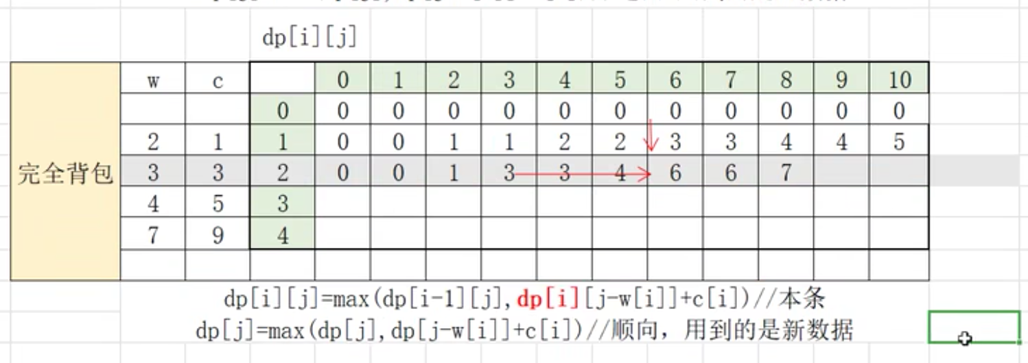 //从右向左扫描,为啥?因为我们要用到上一行的结果,因此上一行的结果不能覆盖,这块还是不太能解释的清楚??? for(int j=total;j>=1;j--){ mem[j] = mem[j]; if(w[i-1]<=j) mem[j] = Math.max(mem[j], mem[j-w[i-1]]+b[i-1]); } System.out.println(Arrays.toString(mem)); } return mem[total]; }public static void main(String[] args) { // System.out.println(getMax(new int[]{1,2,4,2,5},new int[]{1,2,3,2,5},10)); System.out.println(getMax01Optimize(new int[]{1,2,4,2,5},new int[]{1,2,3,2,5},10)); System.out.println(getMaxAllPackOptimize(new int[]{1,2,4,2,5},new int[]{1,2,3,2,5},10)); } }