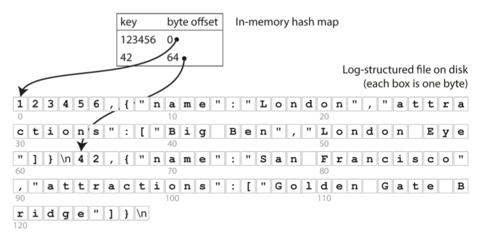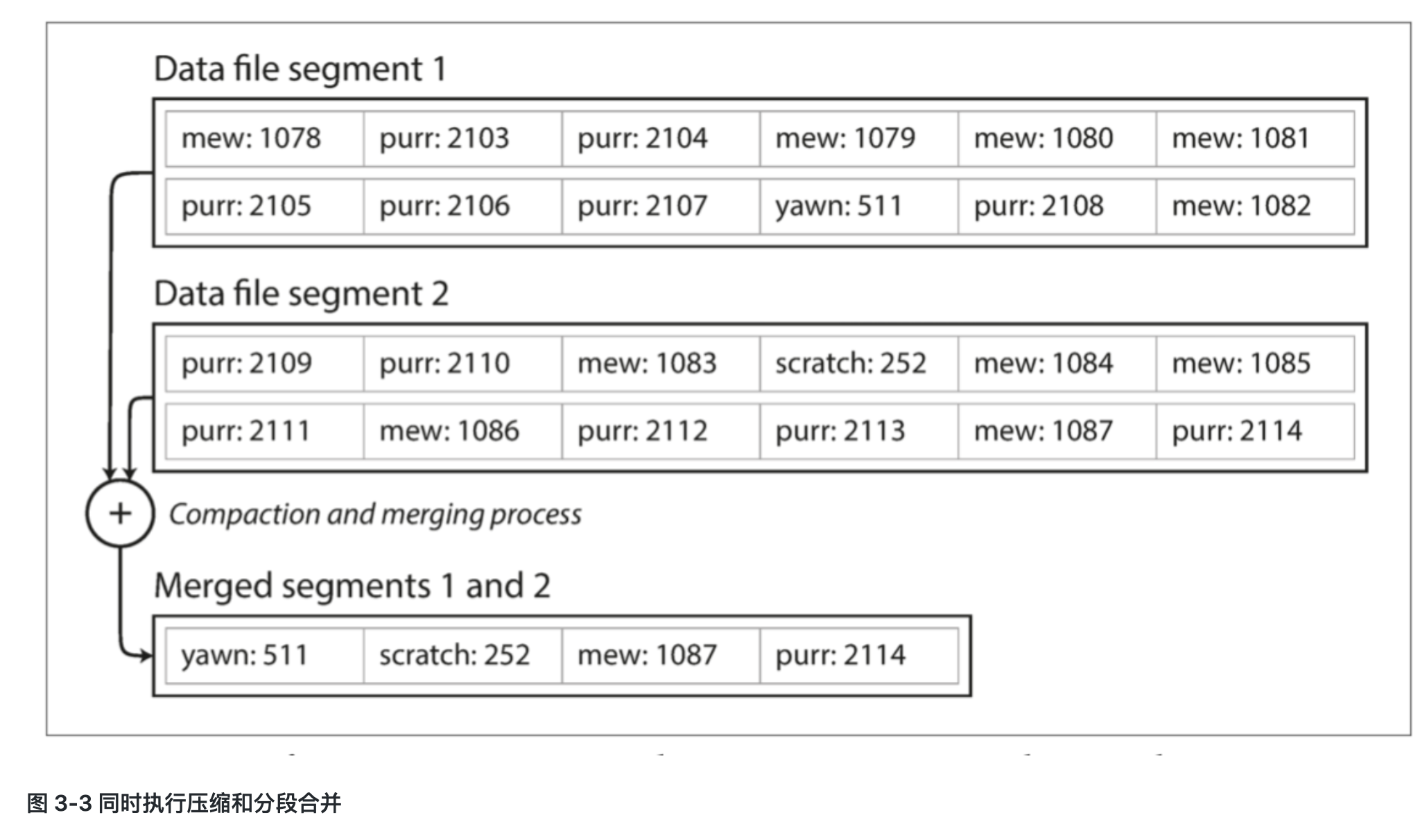 每个段现在都有自己的内存散列表,将键映射到文件偏移量。为了找到一个键的值,我们首先检查最近的段的散列映射;如果键不存在,我们就检查第二个最近的段,依此类推。合并过程将保持段的数量足够小,所以查找过程不需要检查太多的散列映射。