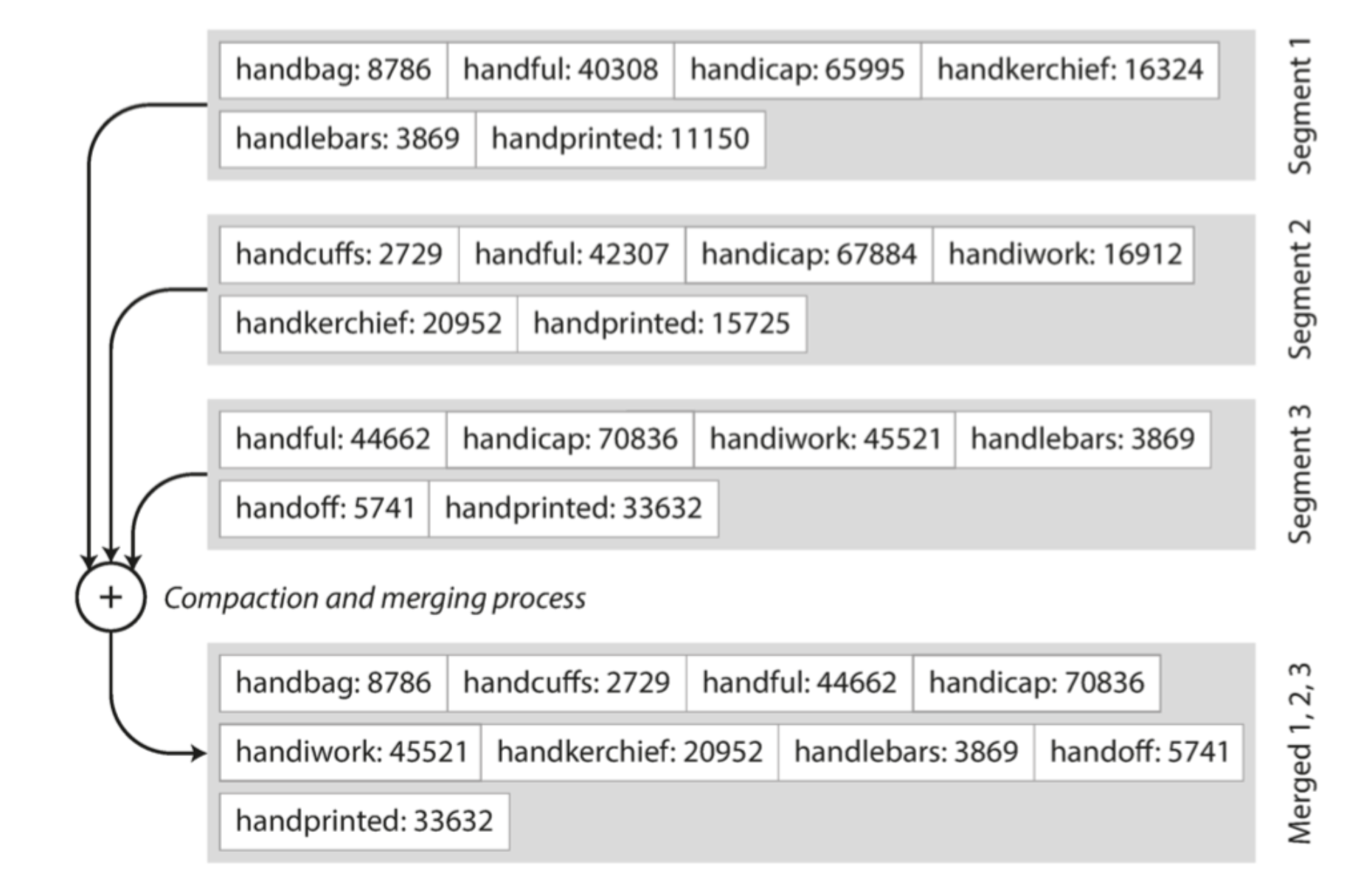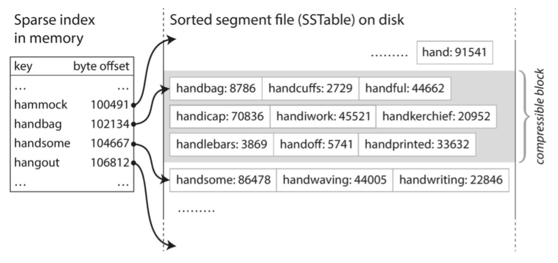 2.我们甚至不需要保存所有的排序过的key,以 图 3-5 为例:假设你正在内存中寻找键 handiwork,但是你不知道这个键在段文件中的确切偏移量。但你知道 handbag 和 handsome 的偏移,而且由于排序特性,你知道 handiwork 必须出现在这两者之间。这意味着你可以跳到 handbag 的偏移位置并从那里扫描,直到你找到 handiwork(或没找到,如果该文件中没有该键)。