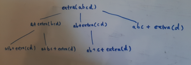 class Solution: def minExtraChar(self, s: str, dictionary: List[str]) -> int: slen = len(s) #计算从curr开始的字符串 def dfs(curr: int): #如果是末尾,那么返回0 if curr == slen: return 0 #设置结果为一个大值 result = 1000000 #从curr开始向后切分 for i in range(curr, slen): ts = s[curr: i + 1] #如果切分的子串在dict中,那么extra cost为0,最终结果为i+1后面的cost if ts in dictionary: result = min(result, dfs(i + 1)) #如果切分的子串不在dict中,那么extra cost为0,最终结果为i+1后面的cost + 当前子串长度 else: result = min(result, dfs(i + 1) + i + 1 - curr) return result return dfs(0)