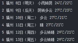 print("序号\t地区\t日期\t天气信息\t温度")