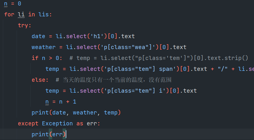 并且原来代码中,爬取今日天气会提示出错,所以还可以继续更改爬取逻辑为: