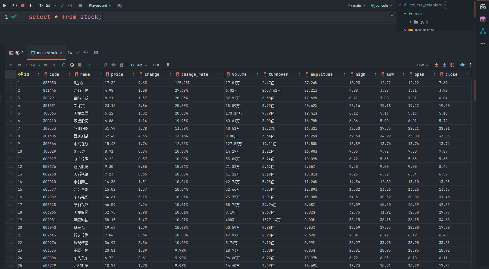 cur.execute('create table if not exists stock(id varchar(10),code varchar(10),name varchar(10),price varchar(10),change varchar(10),change_rate varchar(10),volume varchar(10),turnover varchar(10),amplitude varchar(10),high varchar(10),low varchar(10),open varchar(10),close varchar(10),primary key(id))')