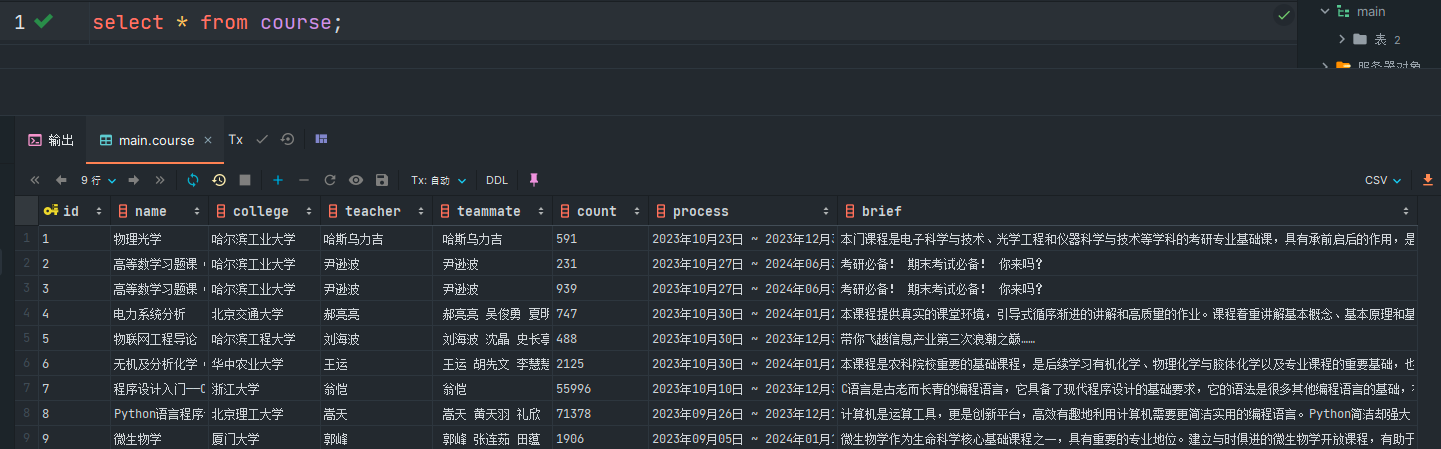 cur.execute('create table if not exists course(id varchar(10),name varchar(10),college varchar(10),teacher varchar(10),teammate varchar(10),count varchar(10),process varchar(10),brief varchar(10),primary key(id))')