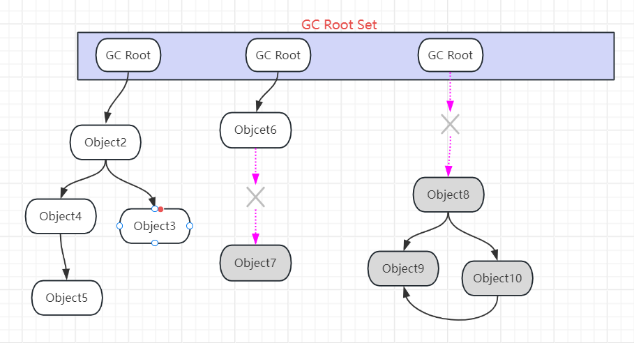 以 GC Roots 为起点,找整个引用链,如果对象没有在任何一个引用链就视为垃圾