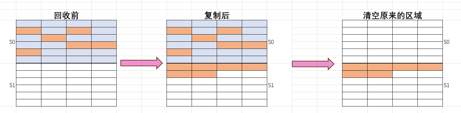 - 缺点:需要两倍空间(虽然没有碎片了,但是要两倍空间);如果存活对象本来就很多,就有点得不偿失了