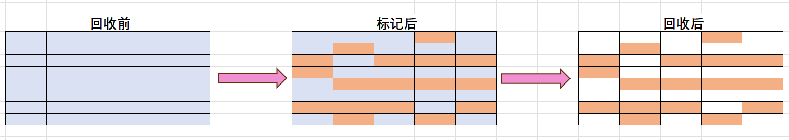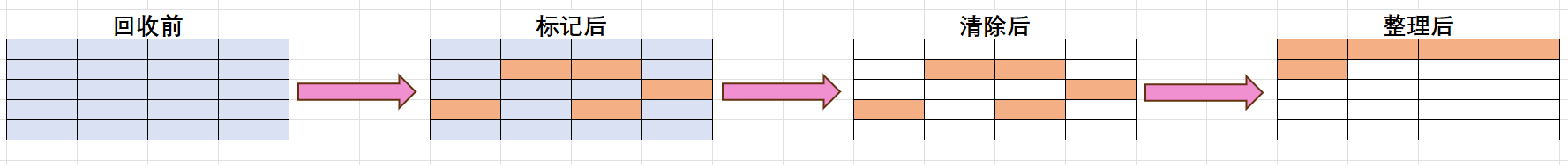 - 缺点:效率不高。比标记-清除多了整理的步骤;比复制多扫描了空间(因为复制算法要保证一半的区域是空的)
