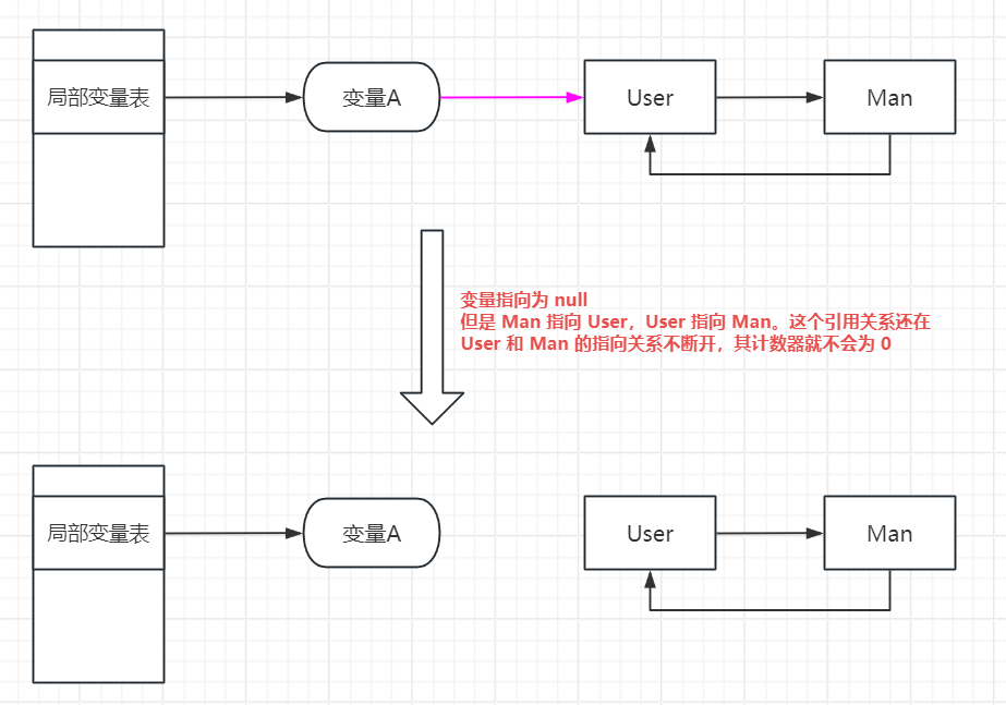 缺点:无法解决循环引用的问题,如下图(明明是垃圾,但是没有被回收,这就是内存泄露)