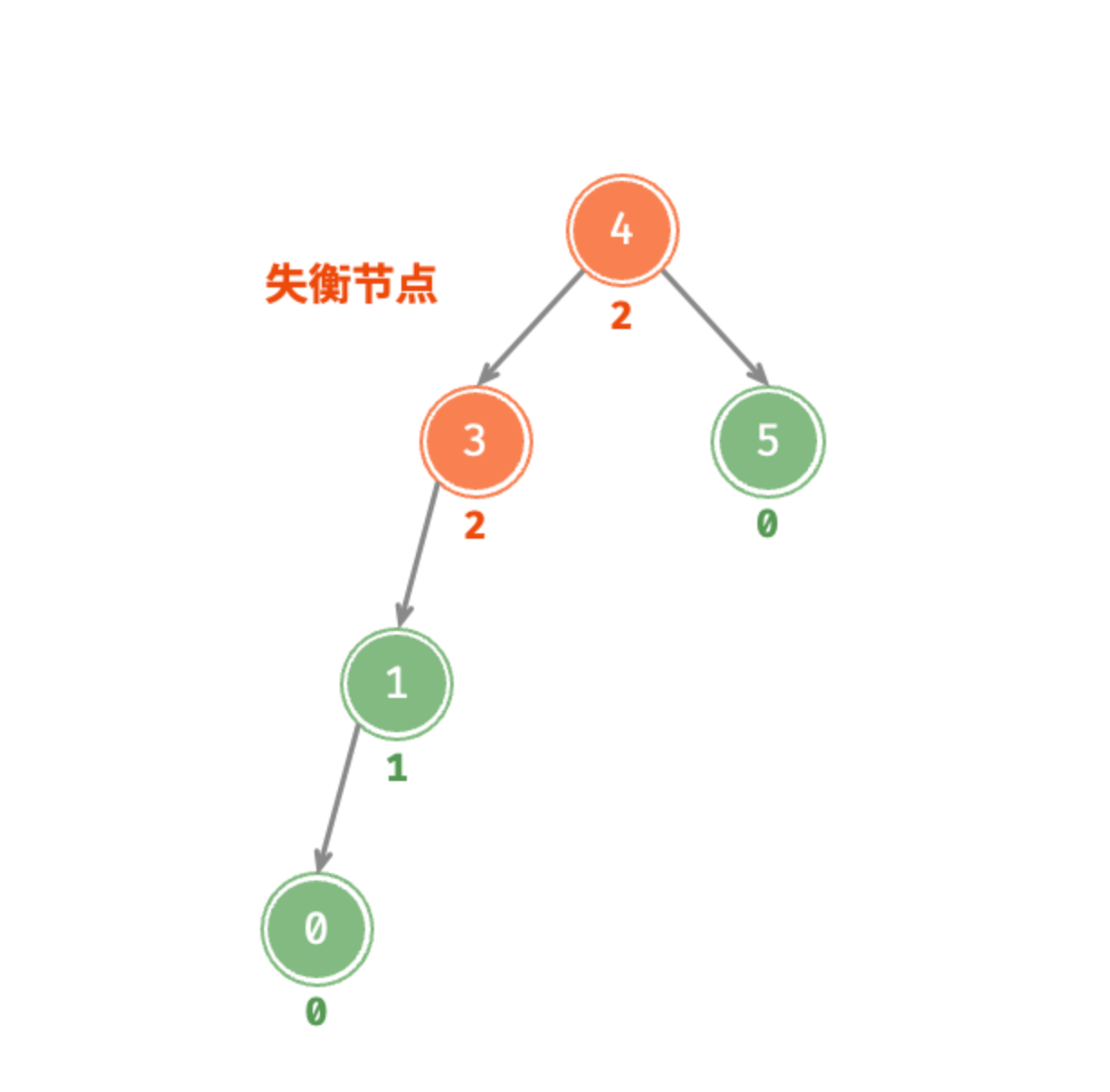 当某个节点的左右子节点的高度差大于1时,这个节点就是失衡节点,如下图 3 和 4 就是失衡节点,平衡因子都是 2