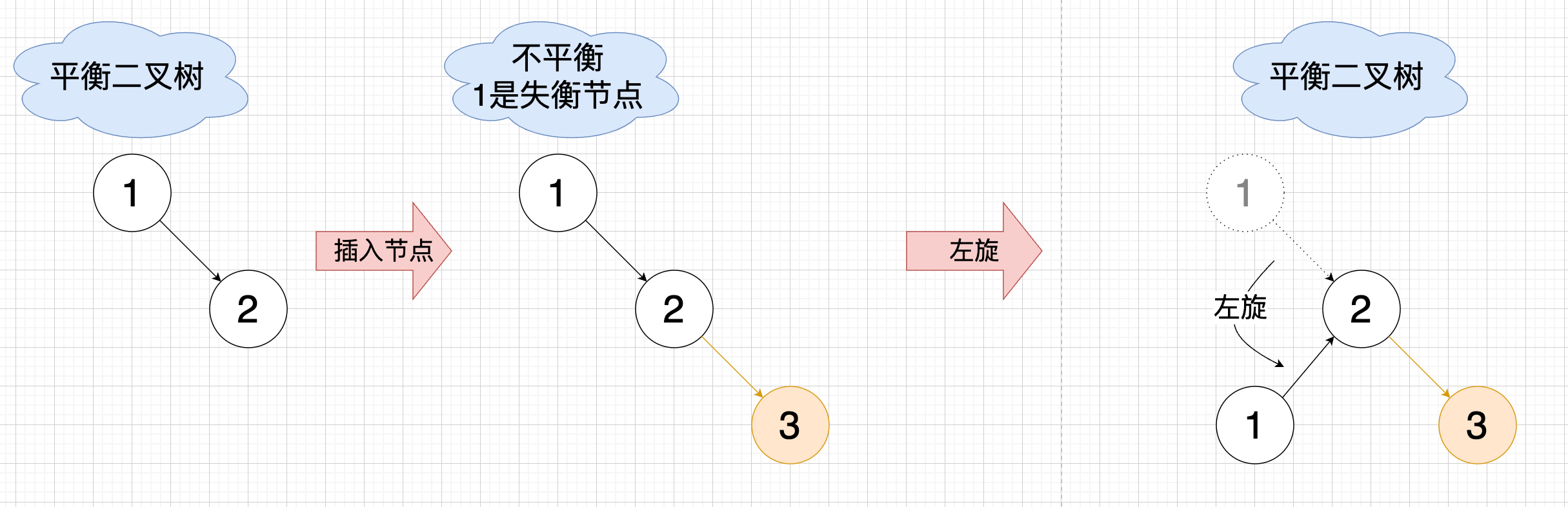 如下图在插入节点3 后, 节点1的右子树高3,左子树高是1,不平衡了,因为平衡因子是 2,并且是一颗右偏树,此时需要左旋