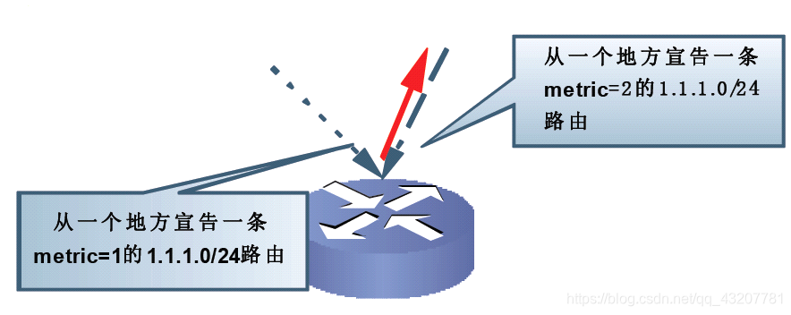 如果同一个接口从不同地方收到了同一条路由信息,但是一个是metric=1,一个