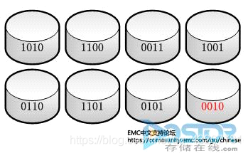 存储方案规划的过程中,最基本的考虑因素有两个,性能和容量。性能上的计算看可以分为IOPS和带宽需求。计算IOPS,抛开存储阵列的缓存和前端口不谈。计算后端物理磁盘的IOPS不能简单的把物理磁盘的最大IOPS相加而获得。原因是,对于不同的RAID级别,为了保证当有物理磁盘损坏的情况下可以恢复数据,数据写入的过程中都需要有一些特别的计算。比如对于RAID-5,条带上的任意磁盘上的数据改变,都会重新计算校验位。如下图所示,一个7+1的RAID-5的条带中,七个磁盘存储数据,最后一个磁盘存储校验位。