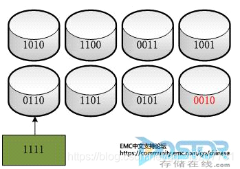 4.然后将1111新数据写入到数据磁盘,将第三步计算出来的新的校验位写入校验盘。