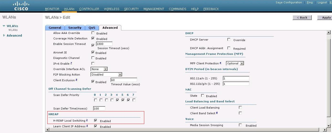 WLAN --> Advanced 选项,选择H-REAP本地交换(H-REAP Local Switching)选项,并确保WLAN的操作是启用的。