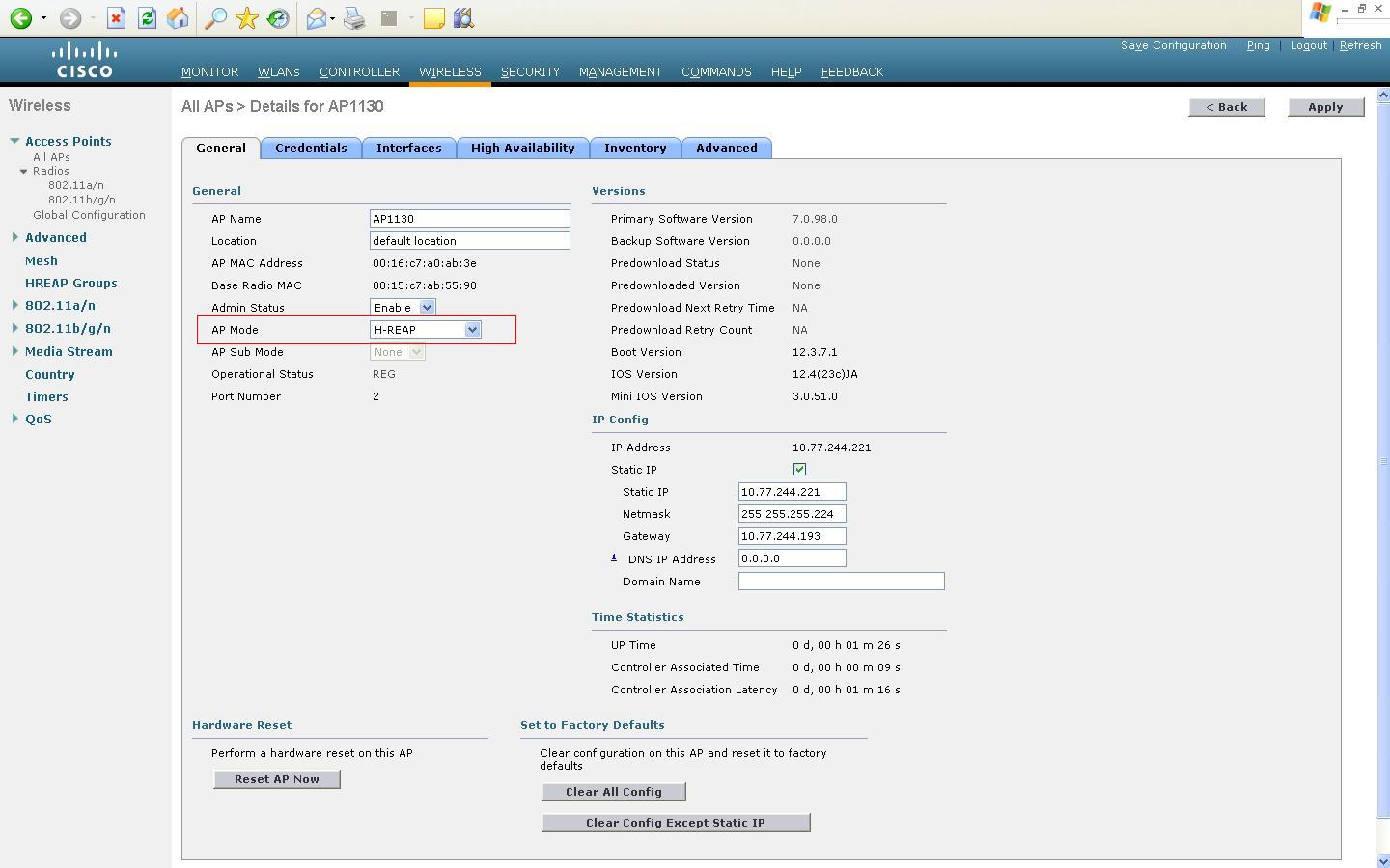 从AP Mode选项下拉菜单选择 H-REAP来改变无线接入点的工作模式。应用后AP会重启。