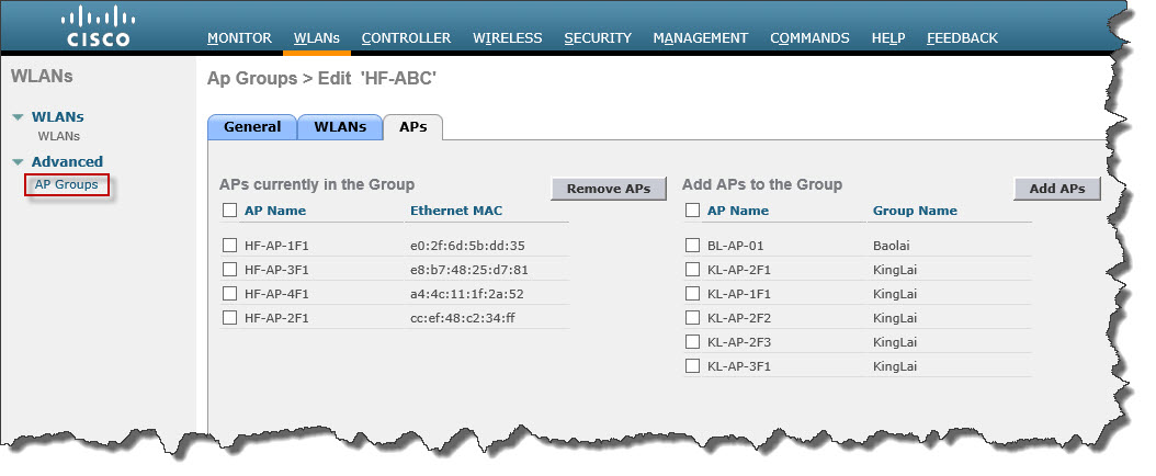 WLANs --> Advanced --> AP groups,新增AP group,在此group中添加指定的AP,添加指定的SSID。