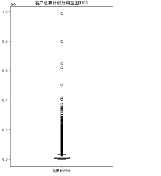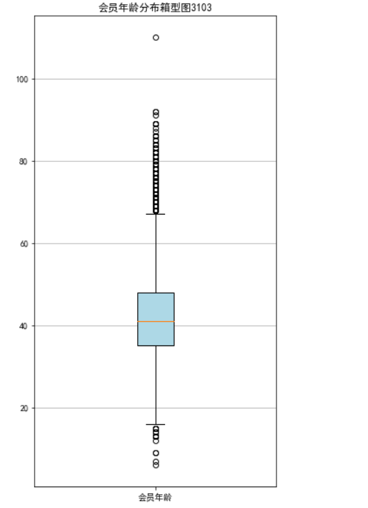 #提取会员年龄age=data['AGE'].dropna()age=age.astype('int64')#绘制会员年龄分布箱型图fig=plt.figure(figsize=(5,10))plt.boxplot(age,patch_artist=True,labels=['会员年龄'],boxprops={'facecolor':'lightblue'})plt.title('会员年龄分布箱型图3103')plt.grid(axis='y')plt.show()plt.close