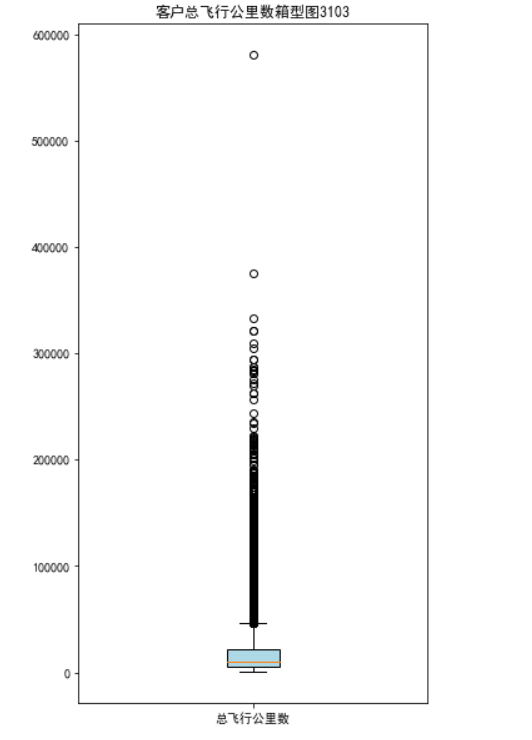 plt.boxplot(sks,patch_artist=True,labels=['总飞行公里数'],boxprops={'facecolor':'lightblue'})