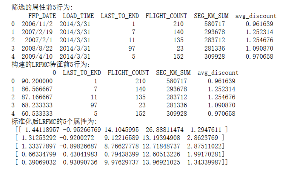 print('构建的LRFMC特征前5行为:\n',airline_features.head())