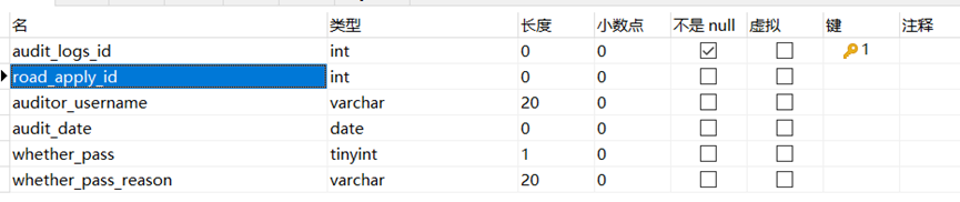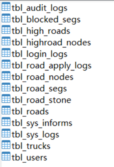 综上考虑,我们小组根据开会以及和老师讨论,初步将数据库定为14个表。我们项目主要是用于大型交通运输,需要3种不同类型的用户:司机提交运输申请,审核员审核申请是否合规,管理员对相应的路线,人员进行一定的管理操作。因此我们开头定义了14个表,其中就有3个不同的用户:管理员,审核员,司机。后面经过胡军老师的验收,我们发现将用户分成三个表实在是冗余,因此我们将其三合一,放成一个用户表,然后又新添了一些表,以满足项目功能的实现。以下是我们所有表名: