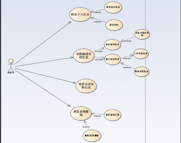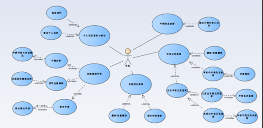 在数据抽象中,由于项目特点,我们在需求分析时。首先抽象出了司机、管理员、审核员三类用例,如下图: