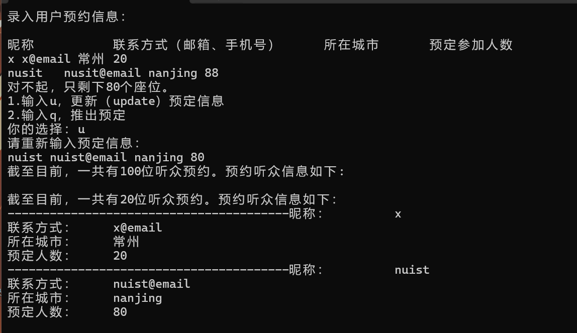 cout << "截至目前,一共有" << count << "位听众预约。预约听众信息如下:" << endl;
