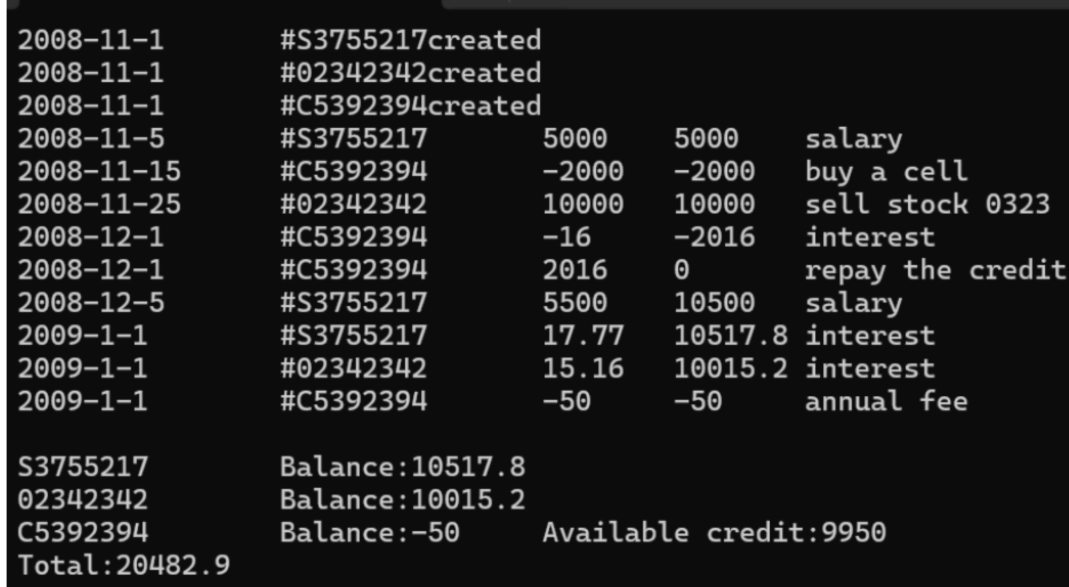 ca.withdraw(Date(2008, 11, 15), 2000, "buy a cell");
