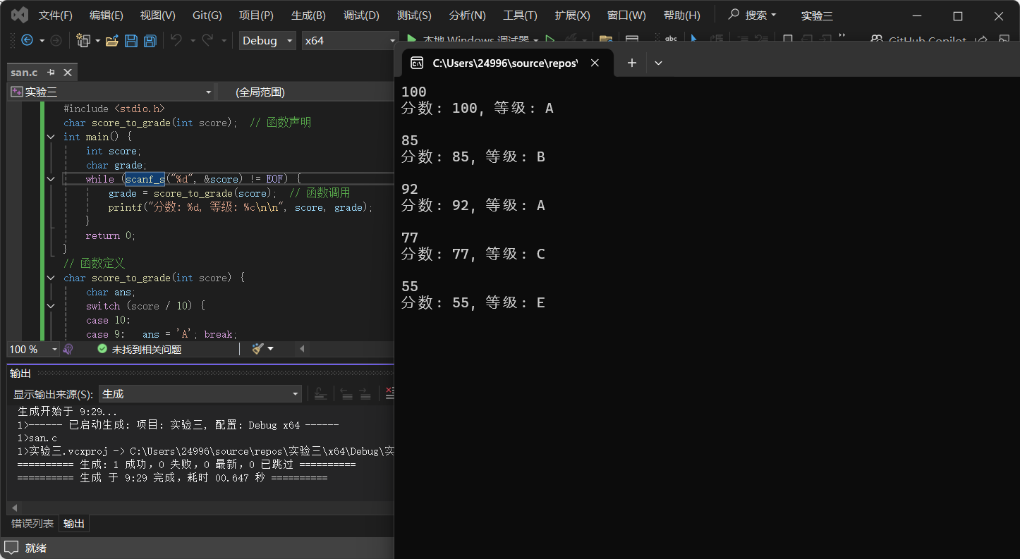 函数score_to_grade的功能是将输入的整数分数(0-100)转换为对应的等级(A-E)。形参类型是int,返回值类型是char。