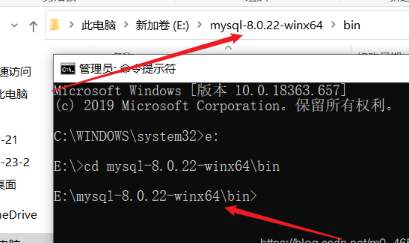 以管理员身份运行 cmd,进入MySQL的 bin 目录,