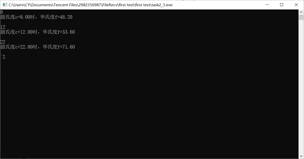 printf("摄氏度c=%.2f时,华氏度f=%.2f\n",c,f);