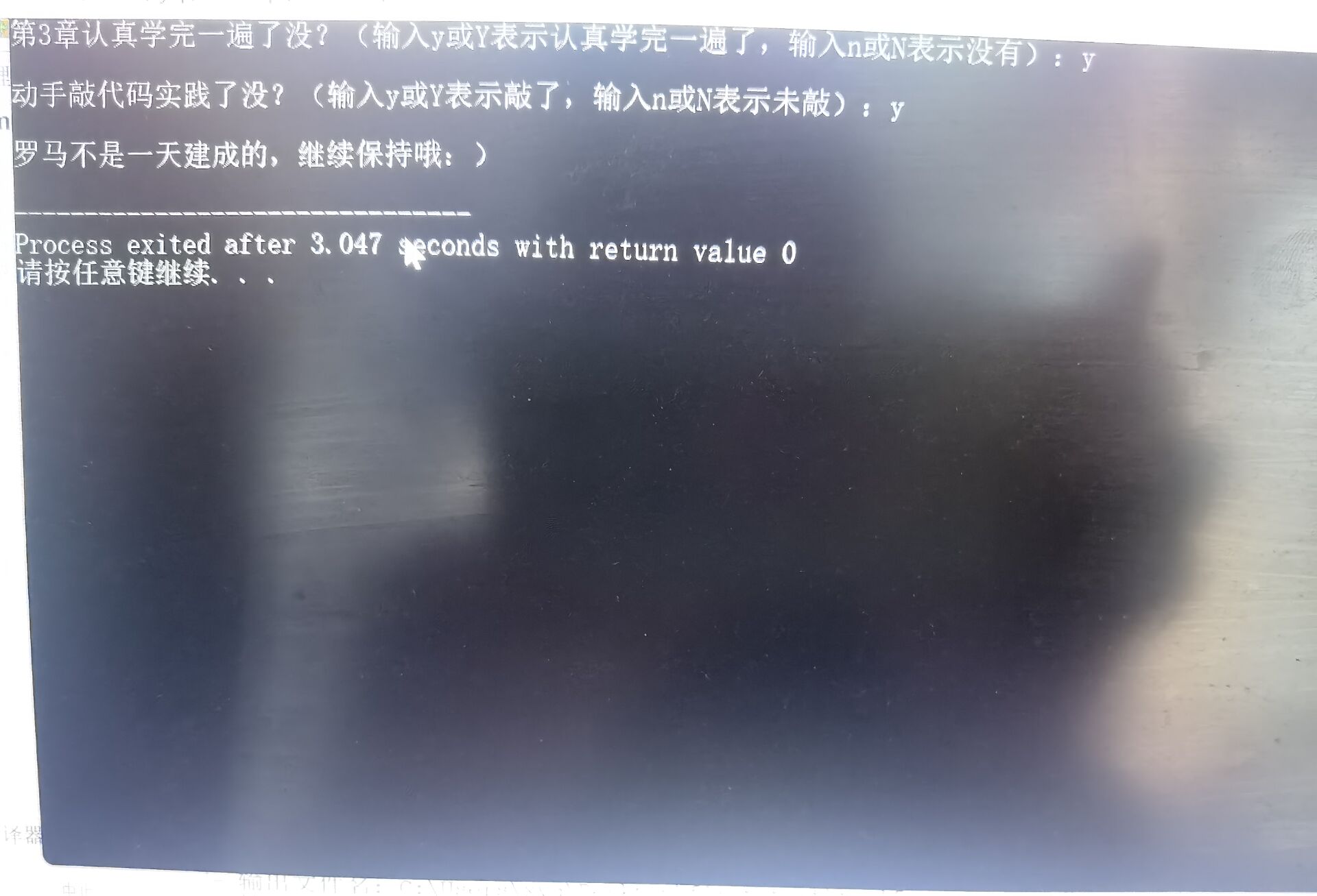 printf("\n动手敲代码实践了没?(输入y或Y表示敲了,输入n或N表示未敲):") ;