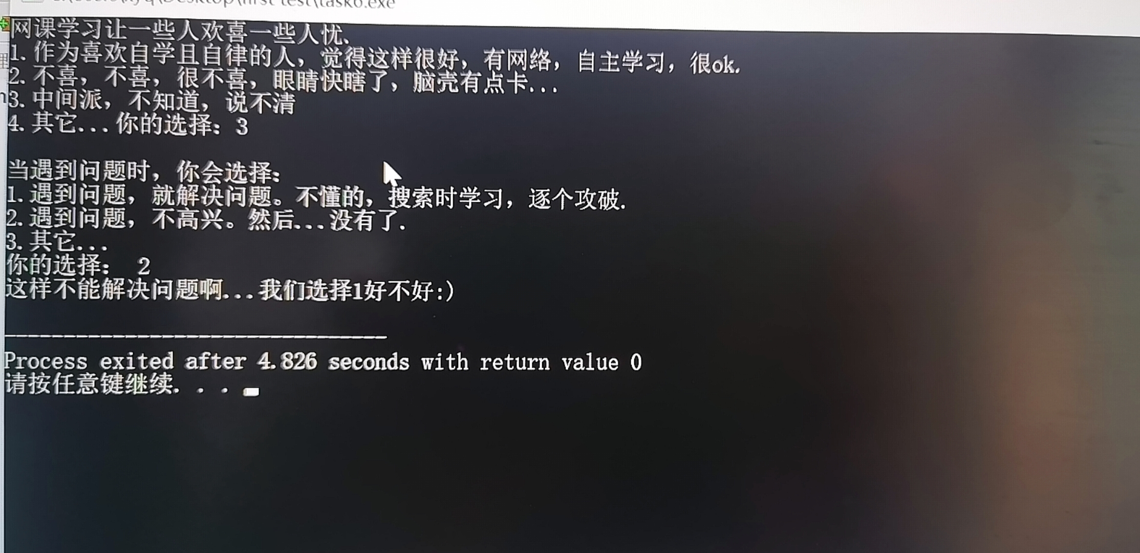 printf("2.不喜,不喜,很不喜,眼睛快瞎了,脑壳有点卡...\n");