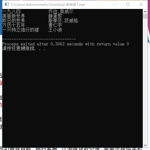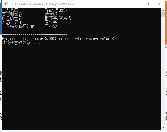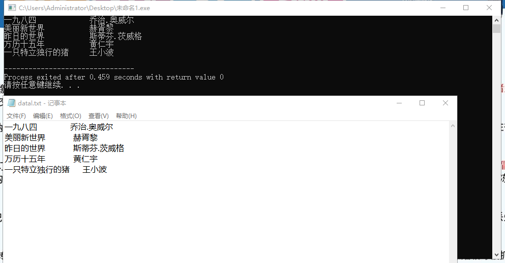 #include<stdio.h> #define N 5 #define M 80 typedef struct { char name[M]; char author[M]; }Book; int main() { Book x[N]={{"一九八四","乔治.奥威尔"}, {"美丽新世界","赫胥黎"}, {"昨日的世界","斯蒂芬.茨威格" }, {"万历十五年","黄仁宇"}, {"一只特立独行的猪","王小波"} }; int i; FILE*fp; fp=fopen("datal.txt","w"); if(fp==NULL) { printf("fail to open file\n"); return 1; } for(i=0;i<N;++i) { fprintf(fp,"%-20s %-20s\n",x[i].name,x[i].author); printf("%-20s %-20s\n",x[i].name,x[i].author); } fclose(fp); return 0; }