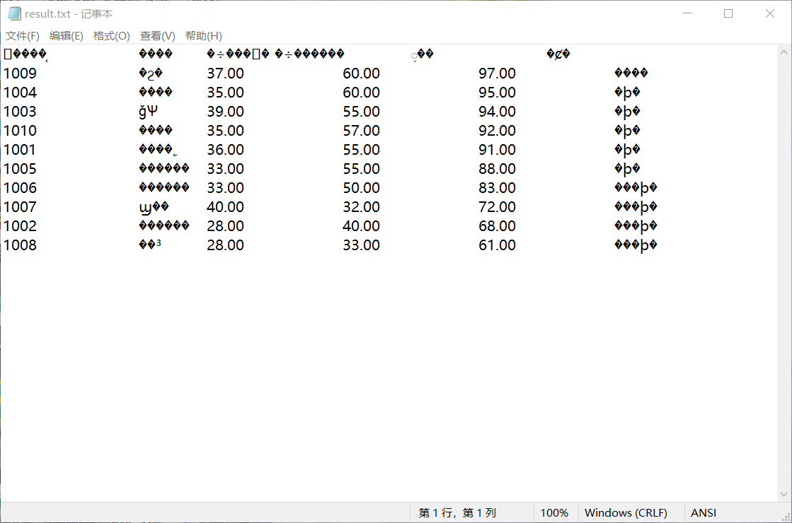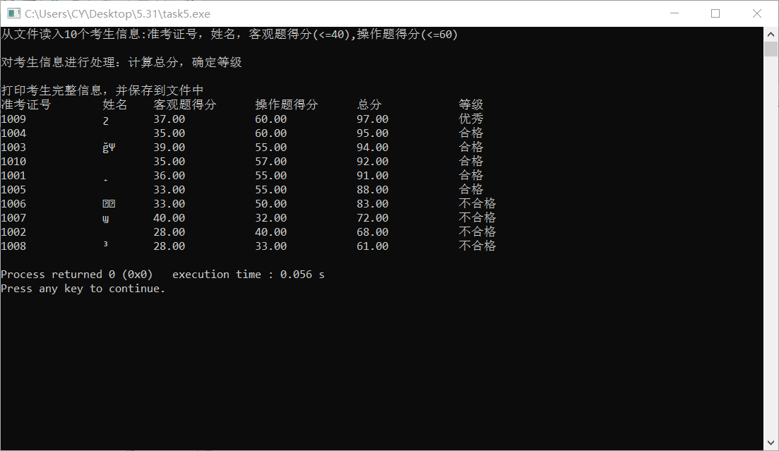 #include <stdio.h> #include <string.h> #include <stdlib.h> #define N 10 typedef struct { long int id; char name[20]; float objective; float subjective; float sum; char level[10]; } STU; void input(STU s[], int n); void output(STU s[], int n); void process(STU s[], int n); int main() { STU stu[N]; printf("从文件读入%d个考生信息:准考证号,姓名,客观题得分(<=40),操作题得分(<=60)\n", N); input(stu, N); printf("\n对考生信息进行处理:计算总分,确定等级\n"); process(stu, N); printf("\n打印考生完整信息,并保存到文件中"); output(stu, N); return 0; } void input(STU s[], int n) { int i; FILE *fin; fin = fopen("examinee.txt", "r"); if (fin == NULL) { printf("fail to open file\n"); exit(0); } while (!feof(fin)) { for (i = 0; i < n; i++) fscanf(fin, "%ld %s %f %f", &s[i].id, s[i].name, &s[i].objective, &s[i].subjective); } fclose(fin); } void output(STU s[], int n) { FILE *fout; int i; printf("\n"); printf("准考证号\t姓名\t客观题得分\t操作题得分\t总分\t\t等级\n"); for (i = 0; i < n; i++) printf("%ld\t\t%s\t%.2f\t\t%.2f\t\t%.2f\t\t%s\n", s[i].id, s[i].name, s[i].objective, s[i].subjective, s[i].sum, s[i].level); fout = fopen("result.txt", "w"); if (!fout) { printf("fail to open or create result.txt\n"); exit(0); } fprintf(fout, "准考证号\t\t姓名\t客观题得分\t操作题得分\t总分\t\t等级\n"); for (i = 0; i < n; i++) fprintf(fout, "%ld\t\t%s\t%.2f\t\t%.2f\t\t%.2f\t\t%s\n", s[i].id, s[i].name, s[i].objective, s[i].subjective, s[i].sum, s[i].level); fclose(fout); } void process(STU s[], int n) { STU temp;int i,j; for(i=0;i<n;i++) { s[i].sum=s[i].objective+s[i].subjective; } for(i=0;i<n;i++) { for(j=0;j<n;j++) { if(s[i].sum>s[j].sum) { temp.id=s[i].id; s[i].id=s[j].id; s[j].id=temp.id; strcpy(temp.name,s[j].name); strcpy(s[j].name,s[i].name); strcpy(s[i].name,temp.name); temp.objective=s[i].objective; s[i].objective=s[j].objective; s[j].objective=temp.objective; temp.subjective=s[i].subjective; s[i].subjective=s[j].subjective; s[j].subjective=temp.subjective; temp.sum=s[i].sum; s[i].sum=s[j].sum; s[j].sum=temp.sum; } } } for(i=0;i<n;i++) { if(i+1<=n*0.1) { strcpy(s[i].level,"优秀"); } else if(i<=n*0.5) { strcpy(s[i].level,"合格"); } else { strcpy(s[i].level,"不合格"); } } }