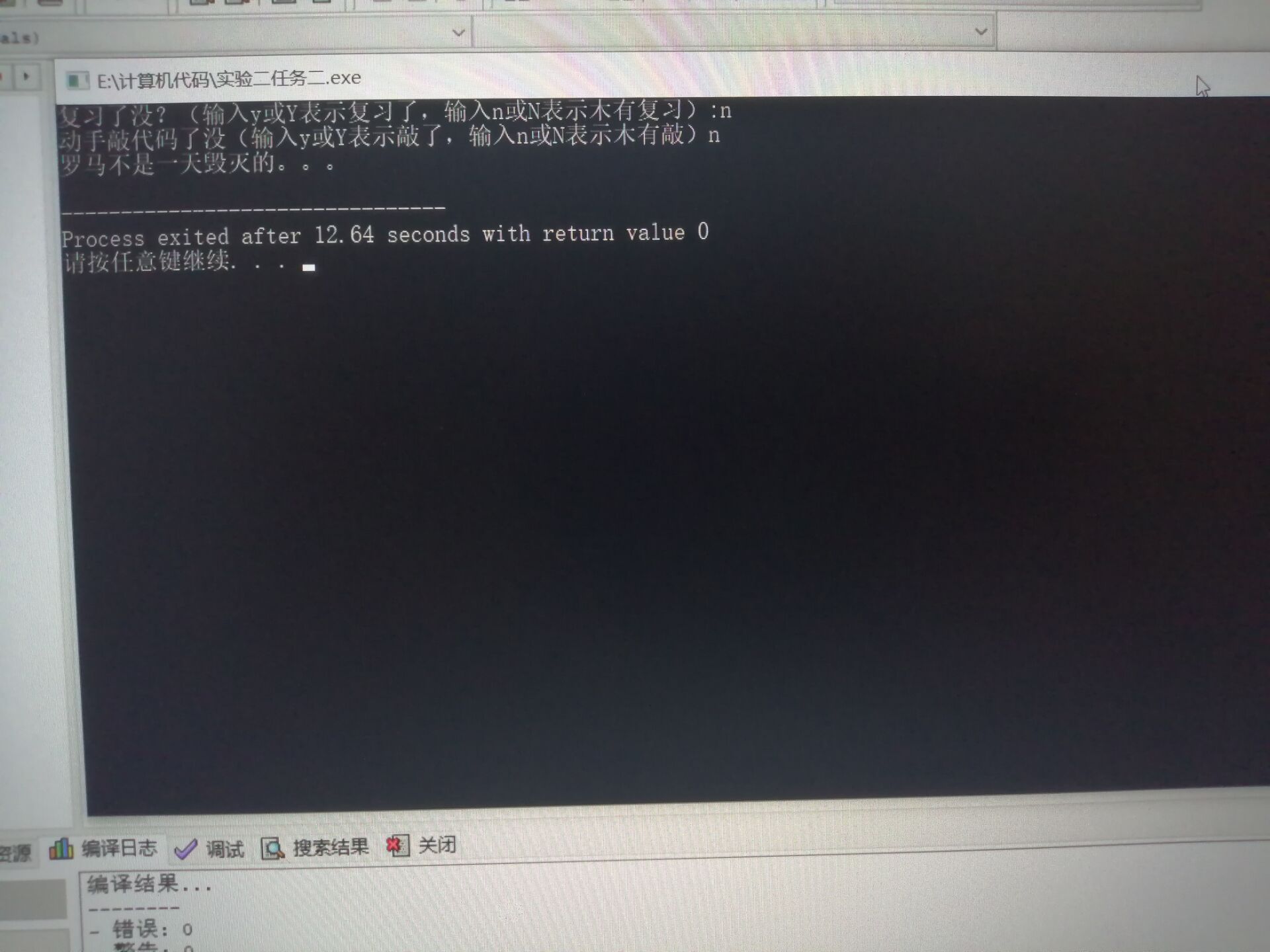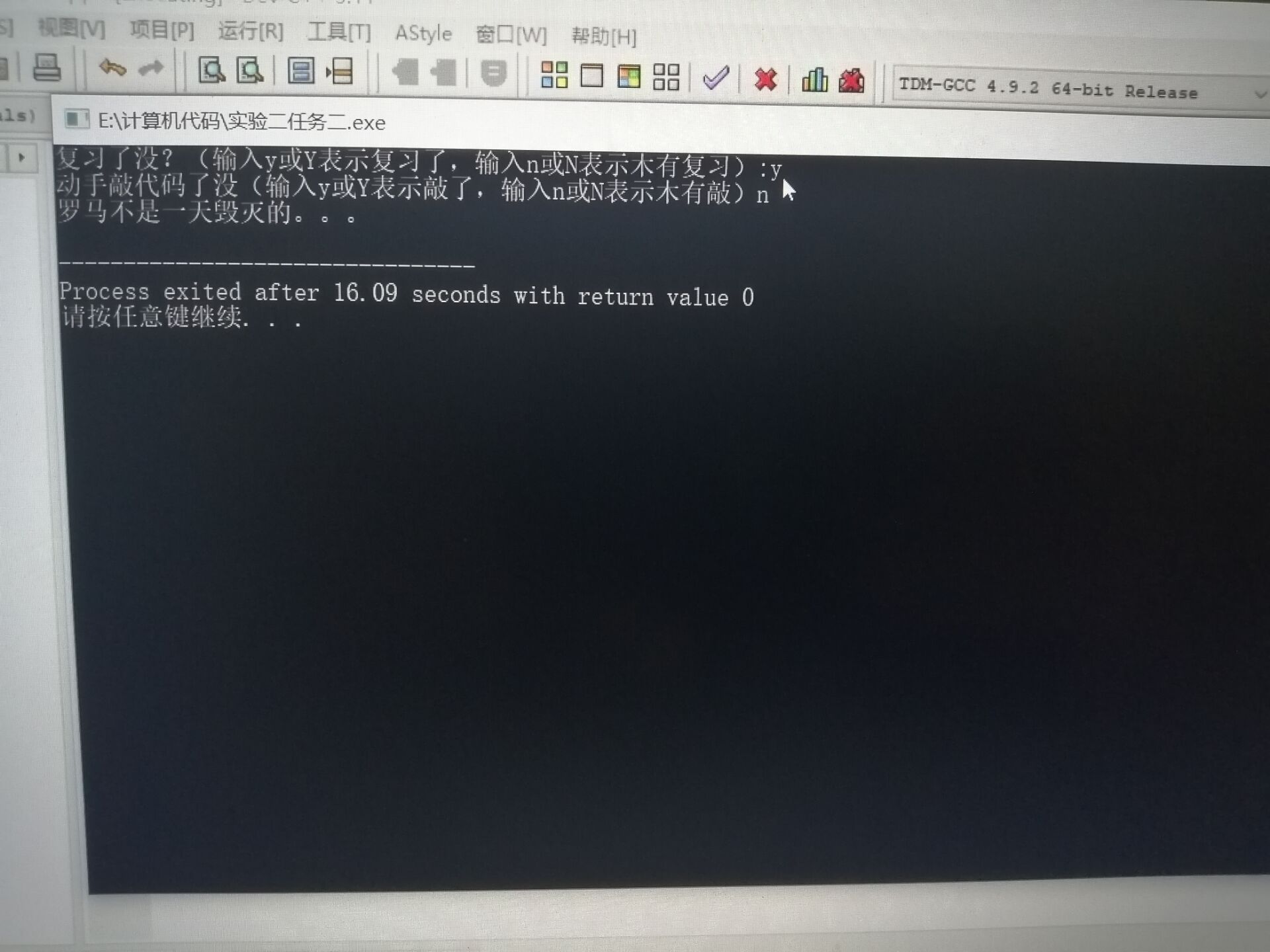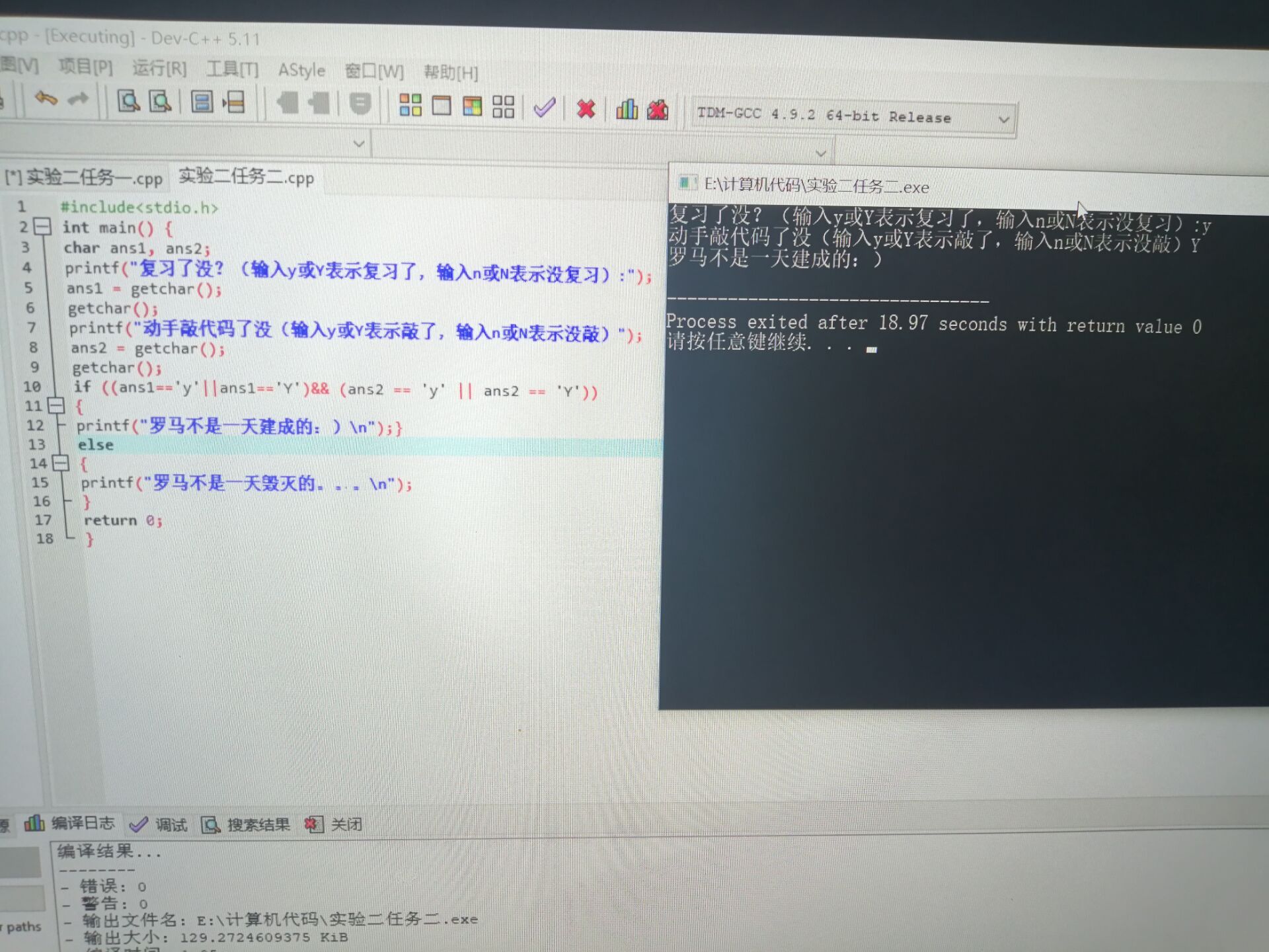 #include<stdio.h> int main() {char ans1, ans2; printf("复习了没?(输入y或Y表示复习了,输入n或N表示木有复习):"); ans1 = getchar(); getchar(); printf("动手敲代码了没(输入y或Y表示敲了,输入n或N表示木有敲)"); ans2 = getchar(); getchar(); if ((ans1=='y'||ans1=='Y')&& (ans2 == 'y' || ans2 == 'Y')) { printf("罗马不是一天建成的:)\n"); } else { printf("罗马不是一天毁灭的。。。\n"); } return 0; }