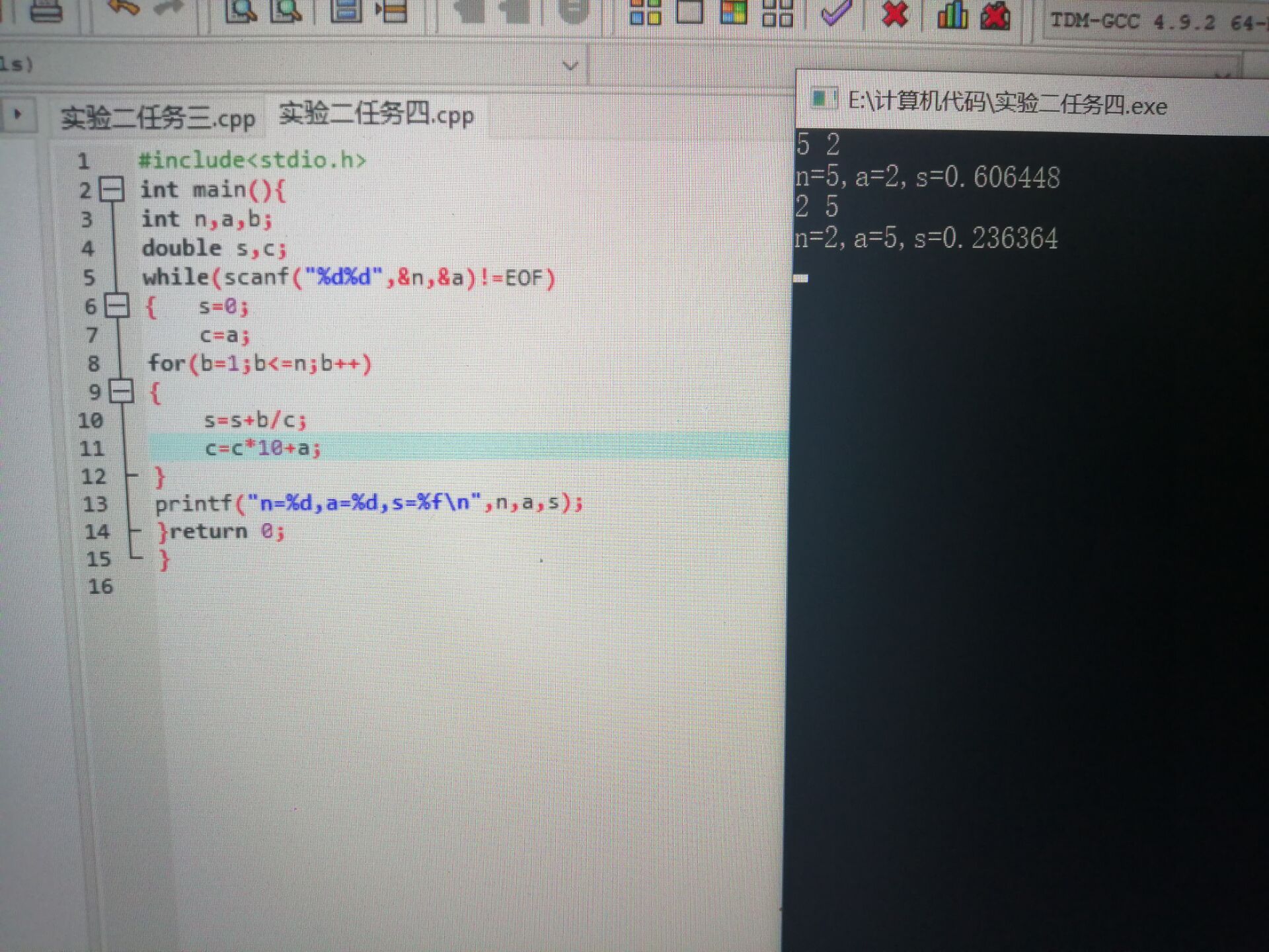 #include<stdio.h> int main(){ int n,a,b; double s,c; while(scanf("%d%d",&n,&a)!=EOF) { s=0; c=a; for(b=1;b<=n;b++) { s=s+b/c; c=c*10+a; } printf("n=%d,a=%d,s=%f\n",n,a,s); }return 0; }