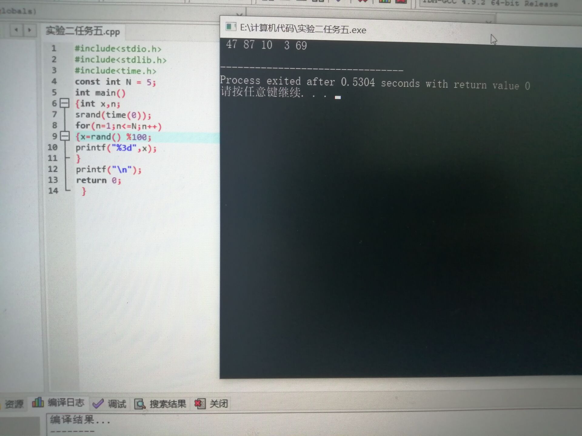 #include<stdio.h> #include<stdlib.h> #include<time.h> const int N = 5; int main() {int x,n; srand(time(0)); for(n=1;n<=N;n++) {x=rand() %100; printf("%3d",x); } printf("\n"); return 0; }