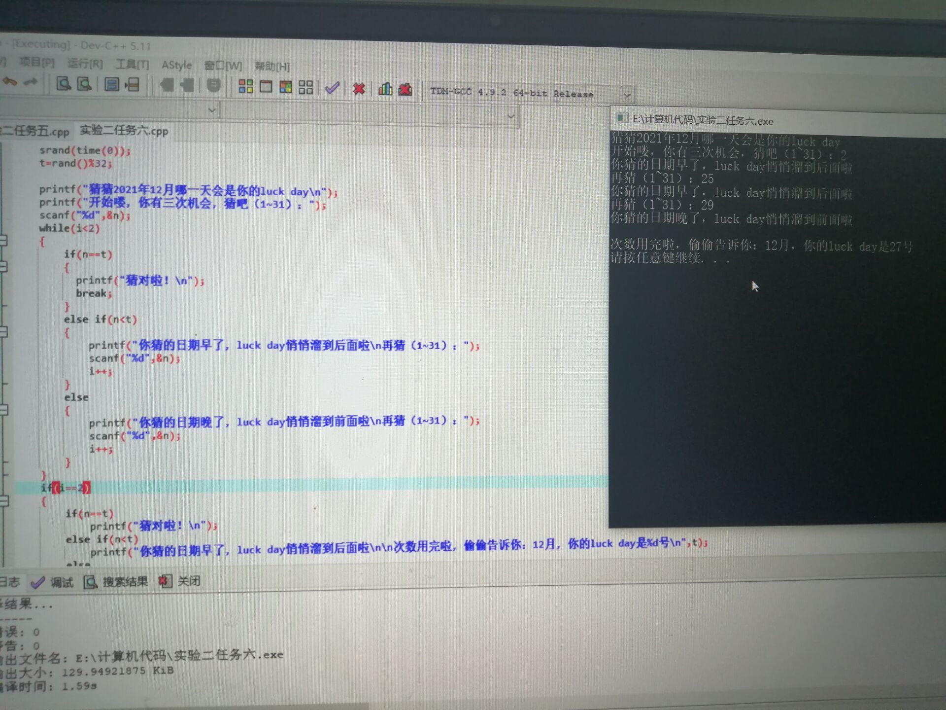 #include<stdio.h> #include<stdlib.h> #include<time.h> int main() { int t,n,i=0; srand(time(0)); t=rand()%32; printf("猜猜2021年12月哪一天会是你的luck day\n"); printf("开始喽,你有三次机会,猜吧(1~31):"); scanf("%d",&n); while(i<2) { if(n==t) { printf("猜对啦!\n"); break; } else if(n<t) { printf("你猜的日期早了,luck day悄悄溜到后面啦\n再猜(1~31):"); scanf("%d",&n); i++; } else { printf("你猜的日期晚了,luck day悄悄溜到前面啦\n再猜(1~31):"); scanf("%d",&n); i++; } } if(i==2) { if(n==t) printf("猜对啦!\n"); else if(n<t) printf("你猜的日期早了,luck day悄悄溜到后面啦\n\n次数用完啦,偷偷告诉你:12月,你的luck day是%d号\n",t); else printf("你猜的日期晚了,luck day悄悄溜到前面啦\n\n次数用完啦,偷偷告诉你:12月,你的luck day是%d号\n",t); } system("pause"); return 0; }