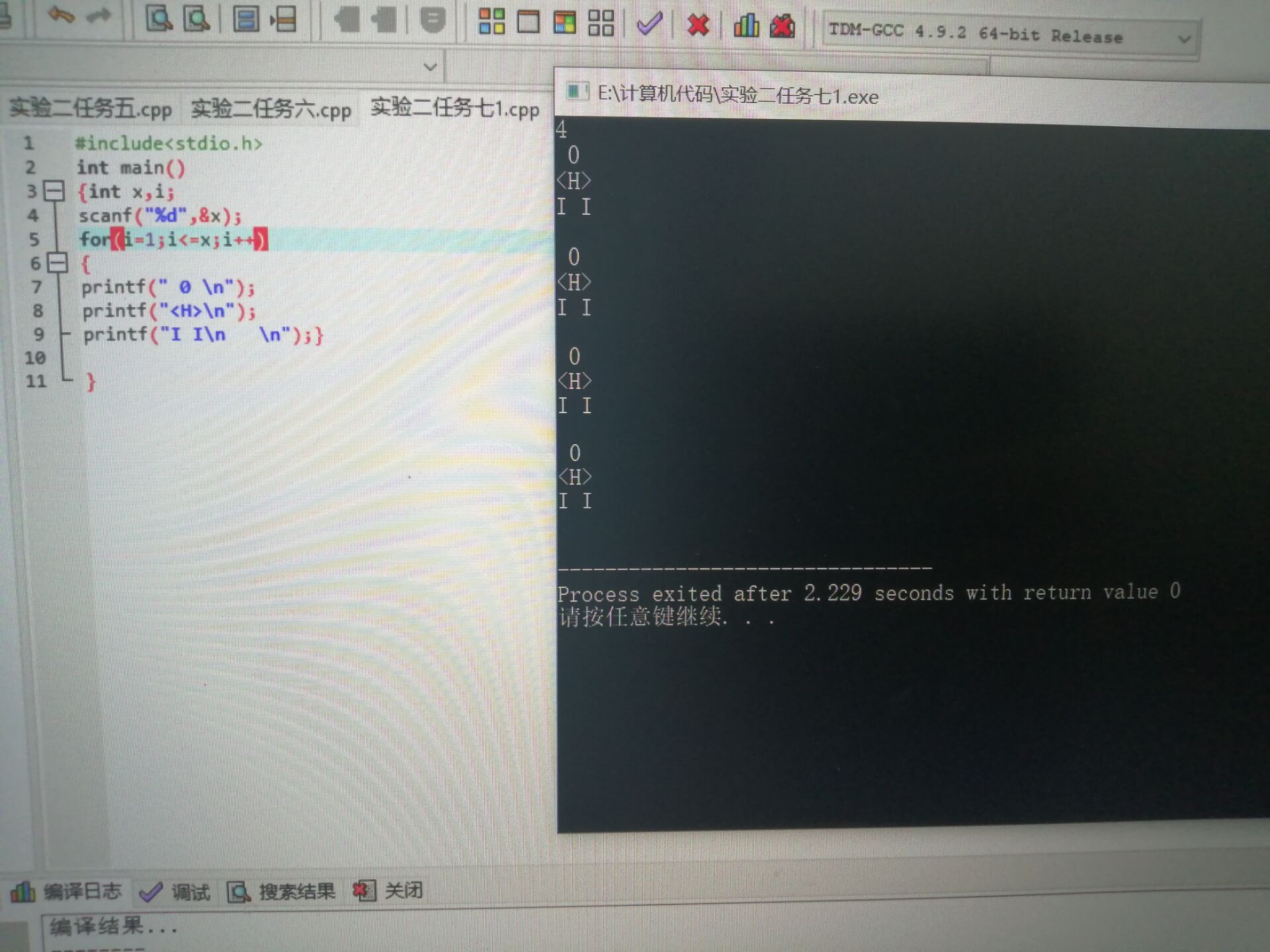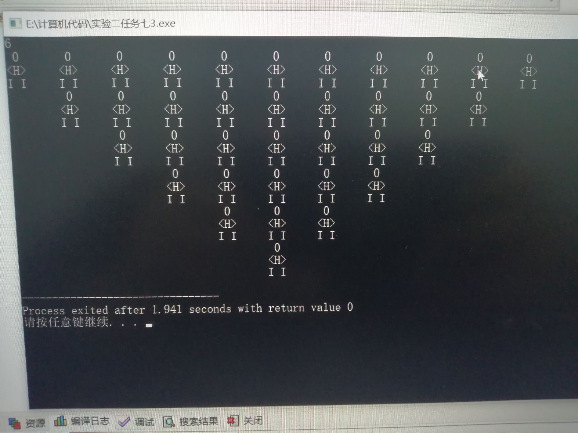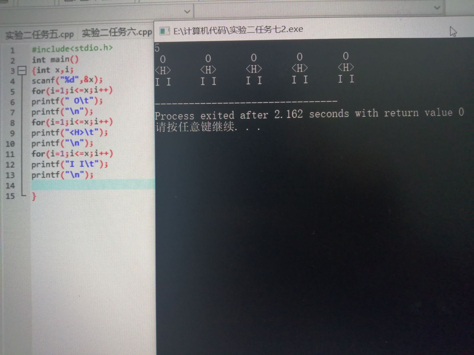 #include<stdio.h> int main(){ int n,b,c,d,e,f; scanf("%d",&n); b=2*n-1; c=0; for(d=1;d<=n;d++) {for(e=1;c>0&&e<=c;e++) printf("\t"); for (f=1;f<=b;f++) {printf(" 0\t"); } printf("\n"); for(e=1;c>0&&e<=c;e++) printf("\t"); for (f=1;f<=b;f++) {printf("<H>\t"); } printf("\n"); for(e=1;c>0&&e<=c;e++) printf("\t"); for (f=1;f<=b;f++) {printf("I I\t"); } printf("\n"); b-=2; c++; } }