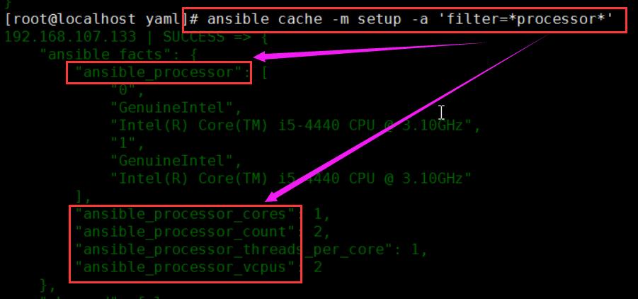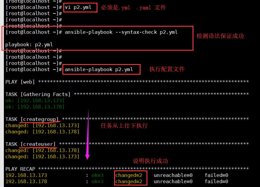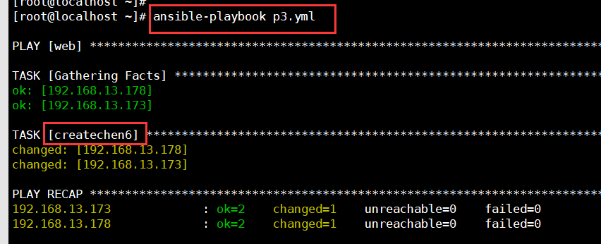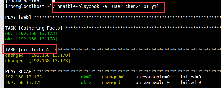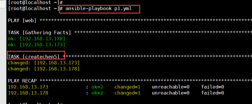 #修改hosts文件 [root@localhost ~]# vi /etc/ansible/hosts 分组时修改 [web] 192.168.13.173 192.168.13.178 [db] 192.168.13.178 192.168.13.209 [db:vars] user=chen5 # 178 209 都创建chen5 #执行 [root@localhost ~]# ansible-playbook p1.yml