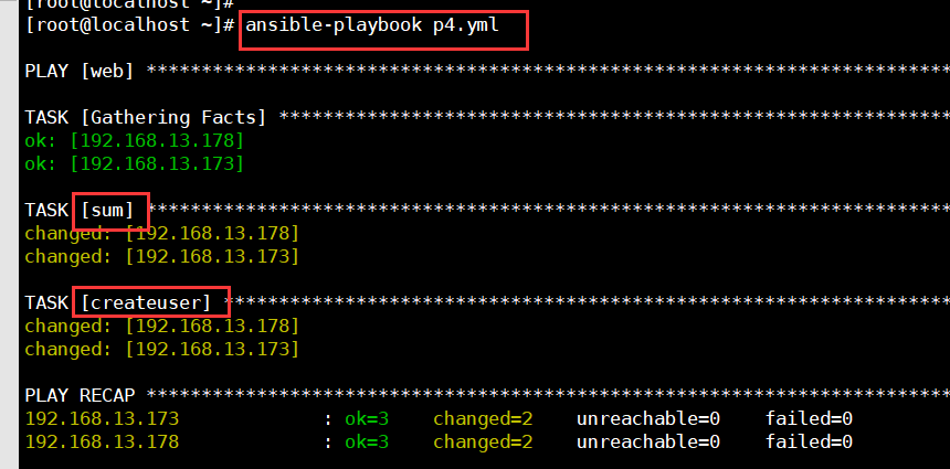 #修改 创建了用户名15 [root@localhost ~]# vi p4.yml ''' - hosts: web tasks: - name: sum shell: echo 7+8|bc register: user - name: createuser user: name={{user.stdout}} ''' #执行 [root@localhost ~]# ansible-playbook p4.yml