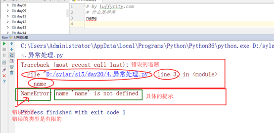 def func1(): name # 只有变量会报错 def func2(): func1() def main(): func2() main() # 在嵌套调用的过程中,内部的代码出了问题, # 外部所有的调用的地方都成为报错追溯信息的一部分 # 怎么解决 # 从下往上找 首先找到你写的代码 出错的那一行 # 看看能不能看出问题 # 就把报错的最后一行 错误类型和详细提示贴到百度里,结合报错的那一行解决问题