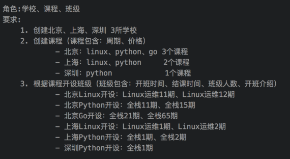 class School: def __init__(self, address): self.address = address bj = School('北京校区') sh = School('上海校区') sz = School('深圳校区') class Course(object): def __init__(self, name, period, price, school=None): # school可以默认为None, self.name = name self.period = period self.price = price self.school = school # 也可以在此处设置为None py1 = Course('Python全栈', 110, 19999, bj) py2 = Course('Python全栈', 110, 19999, sh) py3 = Course('Python全栈', 110, 19999, sz) l1 = Course('Linux运维', 110, 19999, bj) l2 = Course('Linux运维', 110, 19999, sh) g1 = Course('Go开发', 119, 19999, bj) class Grade(object): def __init__(self, name, people, introduce, course=None): self.name = name self.people = people self.introduce = introduce self.course = course gr1 = Grade('全栈1期',20,'....',py1) gr2 = Grade('全栈1期',20,'....',py2) gr3 = Grade('Linux8期',20,'....',l2) print(gr1.people) print(gr1.course.price) print(gr1.course.school.address)