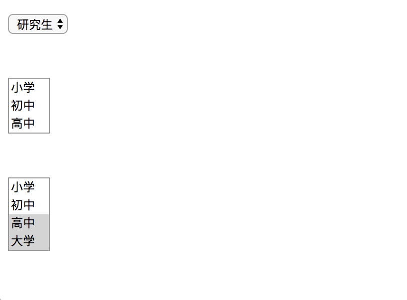 <form> <select> <option>小学</option> <option>初中</option> <option>高中</option> <option>大学</option> <option selected="">研究生</option> </select> <br><br><br> <select size="3"> <option>小学</option> <option>初中</option> <option>高中</option> <option>大学</option> <option>研究生</option> </select> <br><br><br> <select multiple=""> <option>小学</option> <option>初中</option> <option selected="">高中</option> <option selected="">大学</option> <option>研究生</option> </select> <br><br><br> </form>