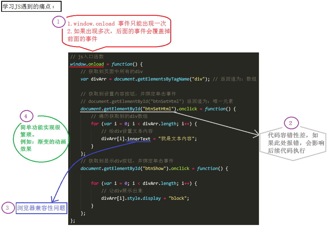 window.onload 事件有事件覆盖的问题,因此只能写一个事件。
