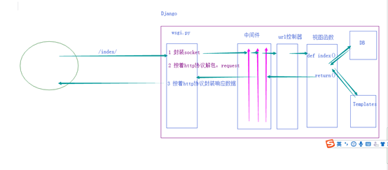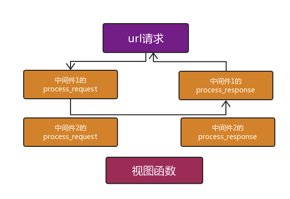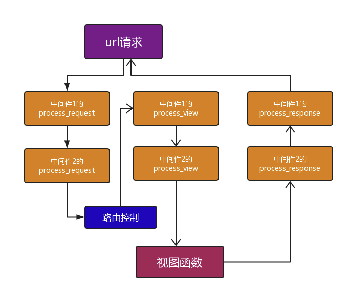 当最后一个中间的process_request到达路由关系映射之后,返回到中间件1的process_view,然后依次往下,到达views函数,最后通过process_response依次返回到达用户。