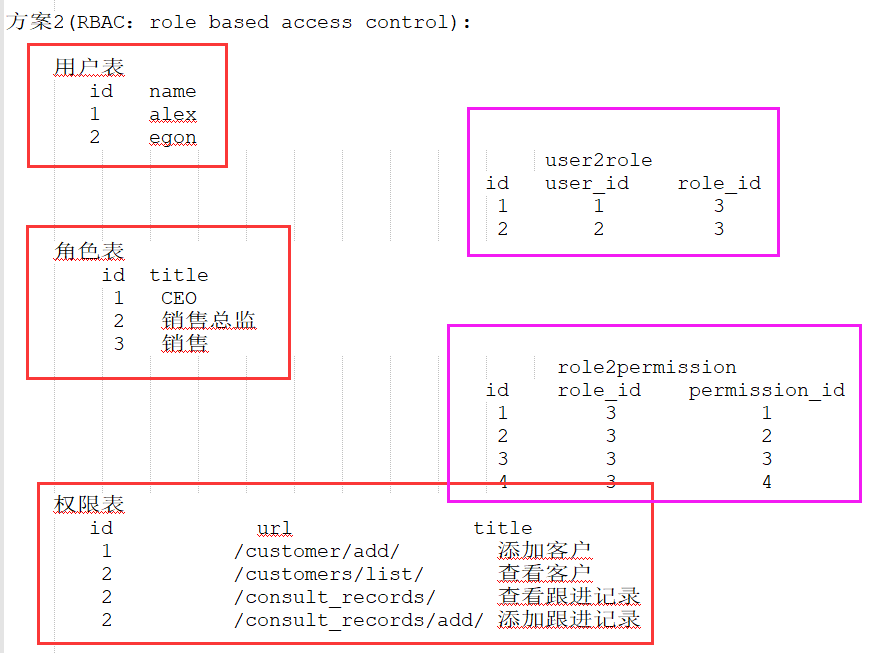 from django.db import models # Create your models here. class User(models.Model): name = models.CharField(max_length=32) pwd = models.CharField(max_length=32) roles = models.ManyToManyField("Role") def __str__(self): return self.name class Role(models.Model): title = models.CharField(max_length=32) permissions = models.ManyToManyField("Permission") def __str__(self): return self.title class Permission(models.Model): title = models.CharField(max_length=32) url = models.CharField(max_length=32) def __str__(self): return self.title