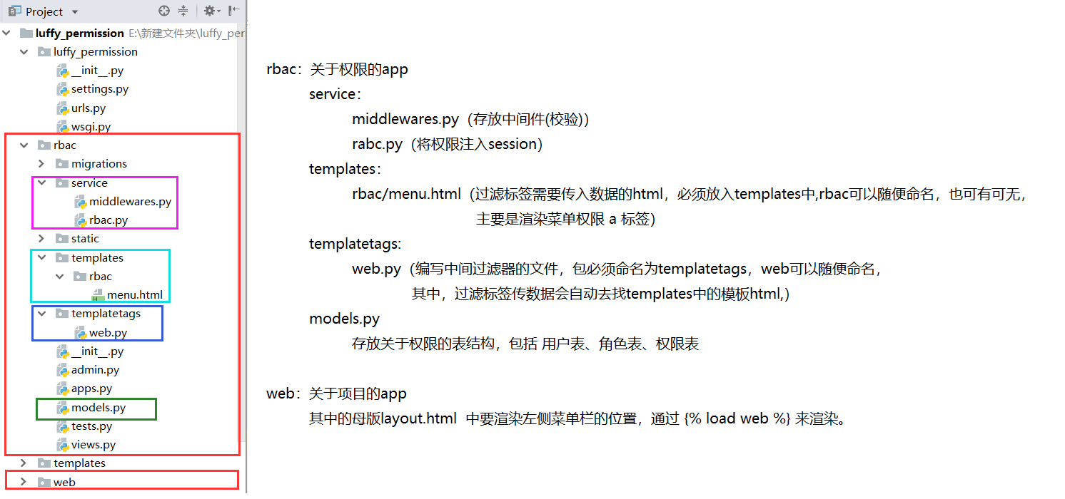 其中,templatetags 是必须命名, web.py 是可以随便起名字的,rbac(app) 整个app项目也是可以随便起名字的,这里因为是跟全年相关的额,所以起名为 rbac