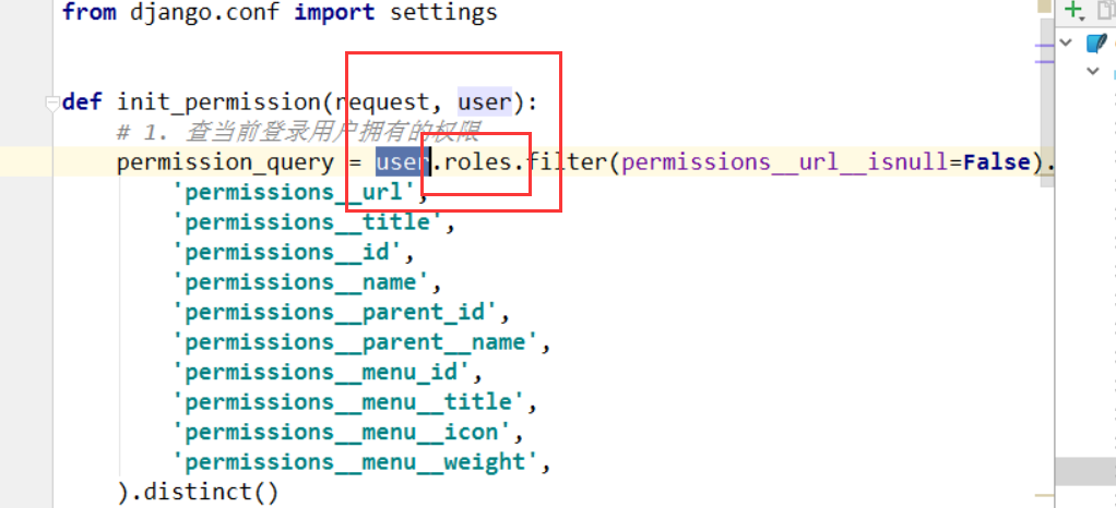 因为注入函数,init_permission(request,user),中 user 对象是权限表中的User记录,因为该对象才有与roles绑定好的角色,如下图: